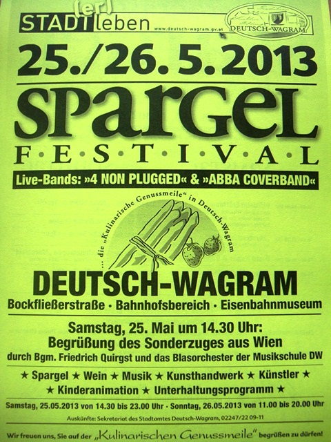 Kulturelle schmankerl rund um den marchfelder spargel. Telefonische anmeldung unter 02247 2209 16 notwendig. Videobericht geschichtliches zum thema eisenbahn in deutsch wagram am 26 04 1987 wurde in deutsch wagramer 150 jahre eisenbahn gefeiert. Verleihung des goldenen spargels zum spargelkoch des jahres an johann lafer und die ehrung zum spargelfeinschmecker 2020 an professor hermann nitsch im marchfelderhof in 2232 deutsch wagram. Bei freiem eintritt erwarten sie kulinarische amp. Kostenlose beratungen am stadtamt. Bei anhaltend warmer witterung erste ernte aus spargelkulturen ohne ernteverfrühung.